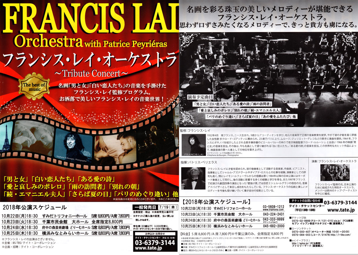 フランシス・レイ・オーケストラとして来日したオーケストラは、本人が来日して披露した1971年のほか、最近では1994年、2018年にコンサートが開催されています。その時の公演チラシを紹介します。